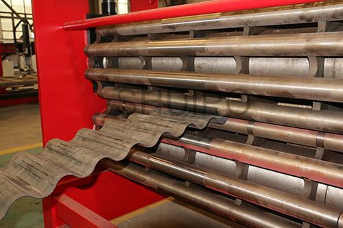 波紋板成型機(jī)主要分為機(jī)架、驅(qū)動(dòng)部分、上壓輪、下壓輪、進(jìn)料導(dǎo)向機(jī)構(gòu)、以及前后工作臺(tái),波紋板成型機(jī)是通過(guò)同時(shí)旋轉(zhuǎn)的上、下壓輪,將平板加工成波紋狀,成型效果一致性好,效率高,波紋的高度調(diào)整有電機(jī)驅(qū)動(dòng),通過(guò)操作控制箱上的按鈕調(diào)整波紋高度范圍,調(diào)整方便,性能可靠。